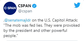 .@senatemajldr on the U.S. Capitol Attack: “The mob was fed lies. They were provoked by the president and other powerful people.”