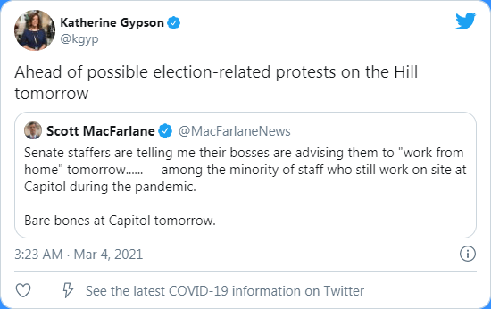 Thursday’s date is connected to a far-right conspiracy theory that Trump, who has repeatedly falsely claimed mass voter fraud cost him the election, would return to power on March 4. That date was inauguration day for U.S. presidents until 1933, when it was moved to Jan. 20.