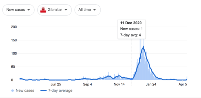 The disaster started on December 12, when an unprecedented surge in cases was witnessed (see graph below). Until that point in time, like in other European countries, Covid cases had been in constant decline for a while. In Gibraltar, numbers of cases had been dropping for almost a month since November 13.
