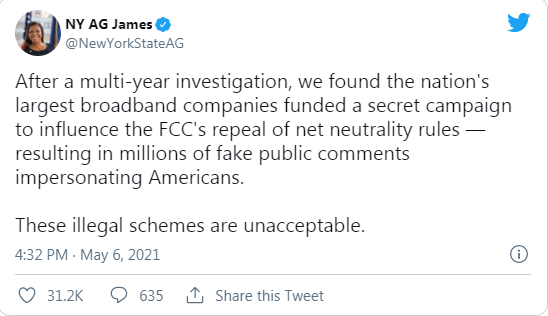 “Today, we are taking action to root out this fraud and the impersonation that has been corrupting the process for far too long,” James continued. “From net neutrality rules to laws affecting criminal justice reform, healthcare and more, these fake comments have simply been generated to influence too many government policies, which is why we are cracking down on this illegal and deceptive behavior.”