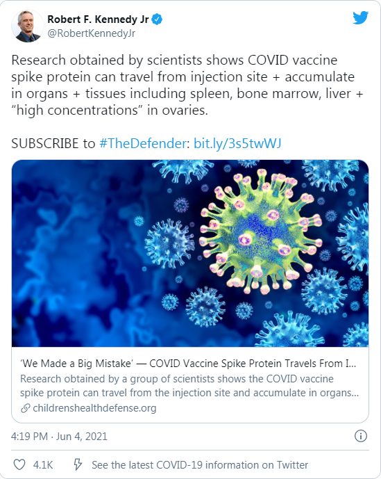 As The Defender and TrialSite News reported, documents obtained by scientists through the Freedom of Information Act (FOIA) revealed pre-clinical studies showing the active part of the vaccine (mRNA-lipid nanoparticles) — which produce the spike protein — did not stay at the injection site and surrounding lymphoid tissue as scientists originally theorized, but spread widely throughout the body and accumulated in various organs, including the ovaries and spleen.