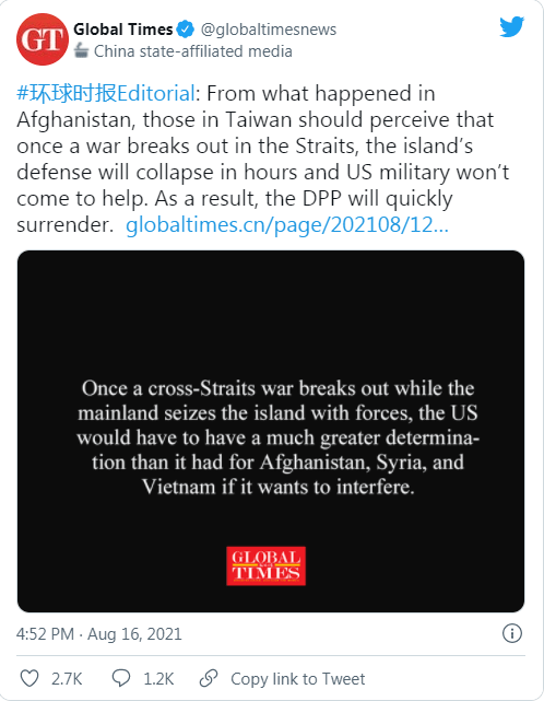 “From what happened in Afghanistan, they should perceive that once a war breaks out in the Straits, the island’s defense will collapse in hours, and the US military won’t come to help,” Global Times said in an editorial. “As a result, the DPP authorities will quickly surrender, while some high-level officials may flee by plane.”