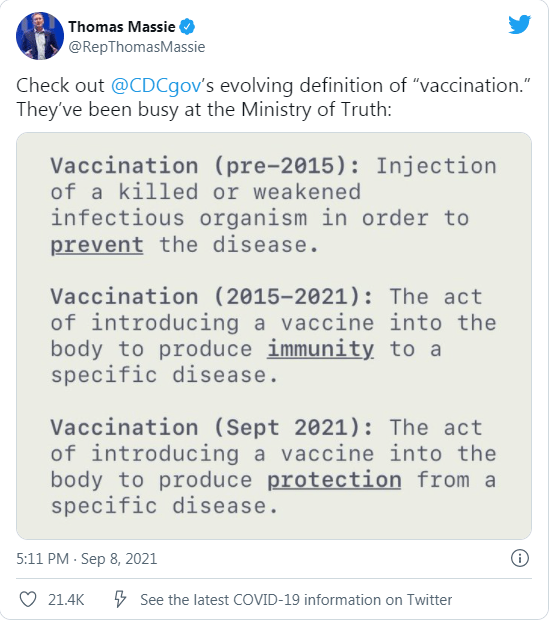 Rep. Thomas Massie (R- K.y.) responded to the news in a tweet, telling his followers to check out the CDC’s evolving definition of “vaccination” and noting the agency has been “busy at the Ministry of Truth.”