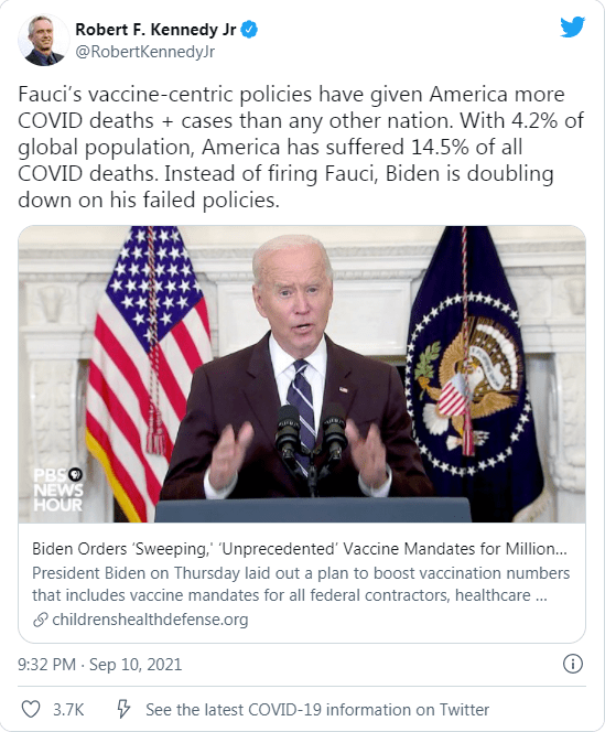 Children’s Health Defense Chairman Robert F. Kennedy, Jr. and longtime vaccine safety advocate, said Biden’s move “to force universal obedience with an unwanted, ineffective and potentially dangerous medical intervention is anti science, anti-democratic and anti American.”