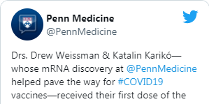 Recently, the University of Pennsylvania tweeted a picture of the Drs. Weissman and Kariko receiving their Covid vaccination, and reminding us of that milestone. One tweet commenting that they should receive the Nobel prize for their discovery.