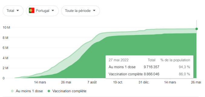 The curve below shows that at the end of May 2022, more than 94% of the Portuguese population received at least one injection and 86% a complete vaccination schedule (3 doses). Herd immunity should largely be achieved. This is not the case, and in 2022, Portugal – whose vaccination rate is among the best in the world – is in the second world position of the countries most affected by the epidemic after Taiwan.